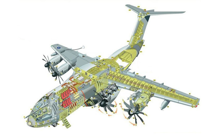 Самолёт получил полностью цифровую кабину с управлением «по проводам», что редкость для транспортников этого класса. Это облегчает пилотирование, снижает нагрузку на экипаж и повышает точность управления при посадке на сложные площадки. В состав бортового оборудования вошёл комплекс обороны DAS, объединяющий датчики лазерного и радарного облучения и автоматические средства постановки помех. A400M также можно использовать как воздушный танкер: дополнительные баки позволяют переносить до 45 тонн топлива, а под крыльями установлены штанги для дозаправки других самолётов. При этом Atlas остаётся полноценным транспортником, а его грузовой отсек можно быстро переоборудовать для военных и гуманитарных операций. Так и получилось, что самолёт получился современным и вполне достойным, но вот с точки зрения итоговой стоимости и возникших в процессе проблем, это был полный провал.