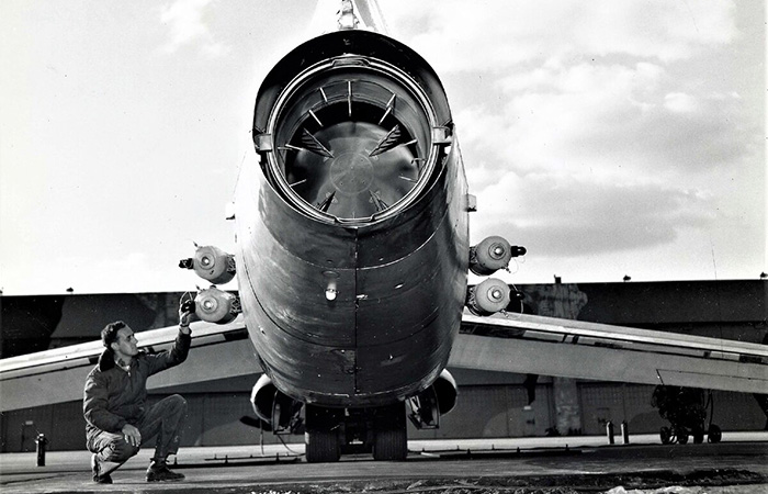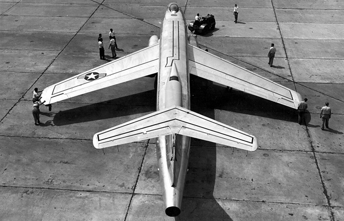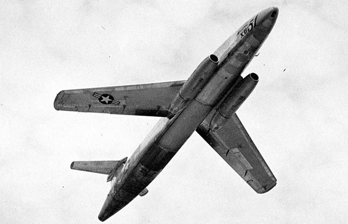 На фоне привычных самолётов того времени он выглядел как корабль из фантастических журналов. Два двигателя располагались не под крылом, как у всех, а под фюзеляжем, ближе к носу. Третий — в хвосте, в верхней части, с воздухозаборником у основания киля. Это казалось безумием, но именно так получилось добиться аэродинамической формы. Вместо традиционного шасси с передней стойкой инженеры использовали велосипедную схему — с двумя основными стойками по центру фюзеляжа и дополнительными опорами под крыльями. Это позволило сделать самолёт тоньше и легче, но сделало взлёты и посадки очень нервными: XB-51 шёл по полосе, балансируя как канатоходец.