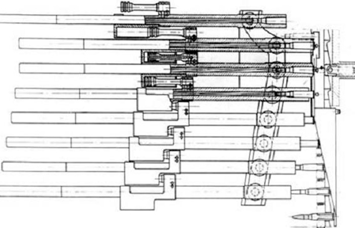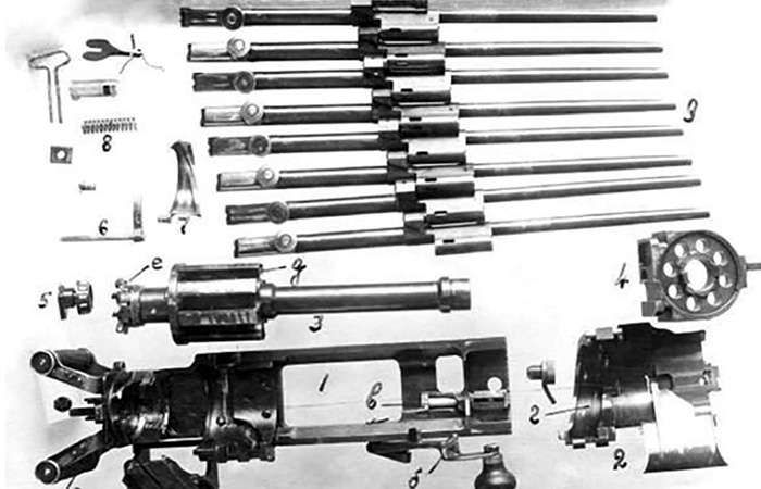 В основе пулемёта лежала очевидная, но смелая конструкция, свойственная Гатлингу: не пытаться выжать всё из одного ствола, а распределить нагрузку между несколькими одновременно работающими. Восьмиствольный блок позволял чередовать выстрелы с такой частотой, что для наблюдателя стрельба казалась непрерывной. Каждому стволу доставлялся патрон по круговой схеме, затворы синхронизировались, а в итоге благодаря вращающемуся механизму сильно снижался нагрев. Интересно, что в отличие от схемы классического Гатлинга с внешним приводом, у пулемётов Слостина использовался внутренний привод, работавший за счёт пороховых газов: каждый ствол имел собственный газовый механизм.